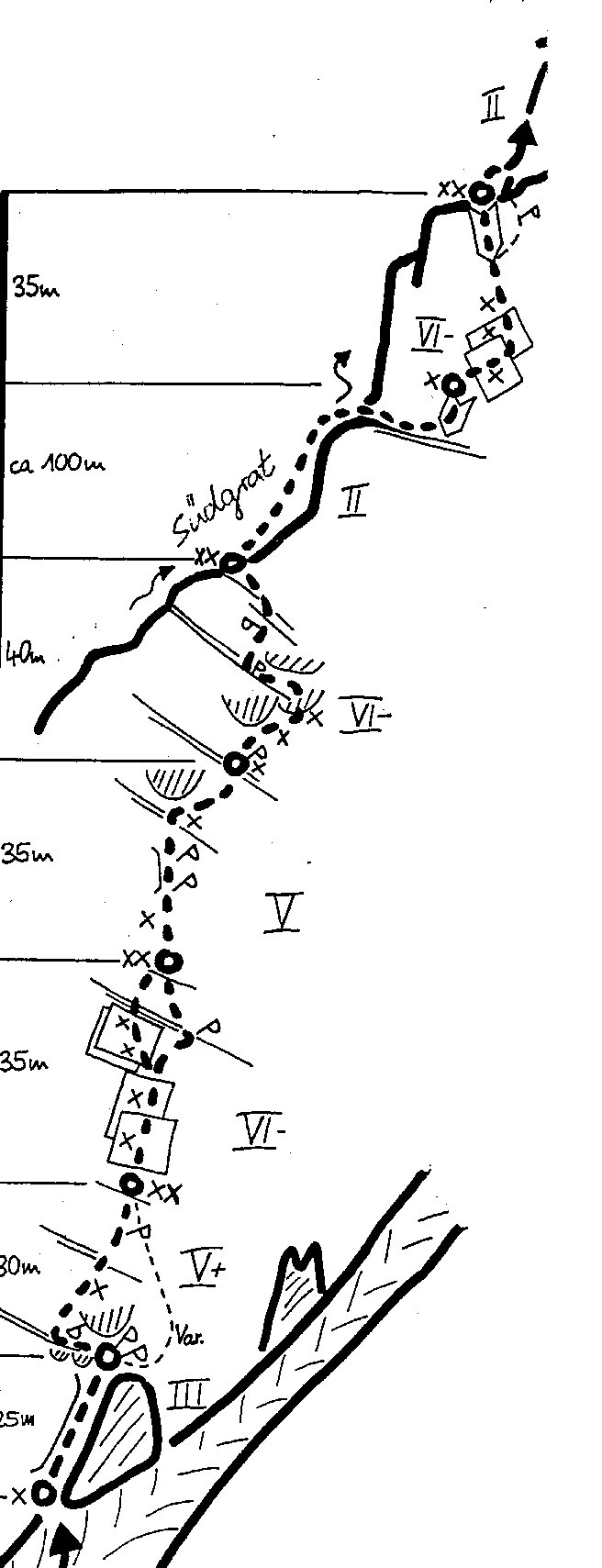 Wandhöhe 200m, VI- (3 Stellen), sonst IV bis V, 2 - 3 Stunden. Alle erforderlichen Haken stecken. KK und Friends 2,5 - 3,5 empfehlenswert. 45m Seil.