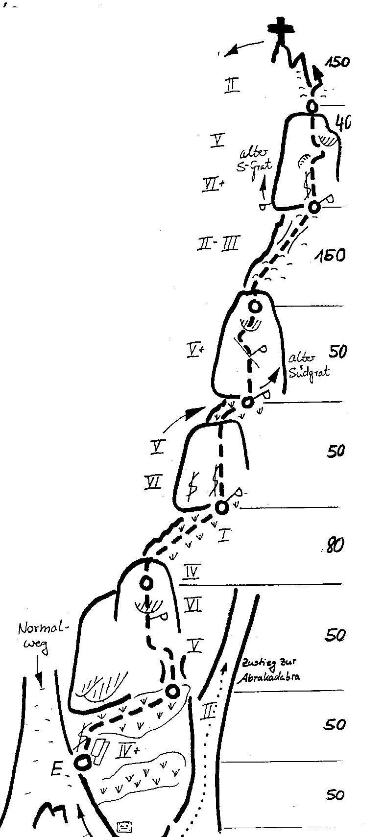 Wandhöhe 300m, Kletterstrecke erheblich länger! 6+ (1SL.), 6 (2SL.) sonst leichter. Material: Rocks, Friends 0,5 - 3, Schlingen. Kletterzeit 3 - 5 Stunden.