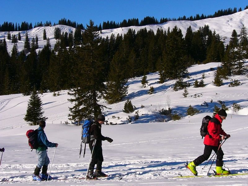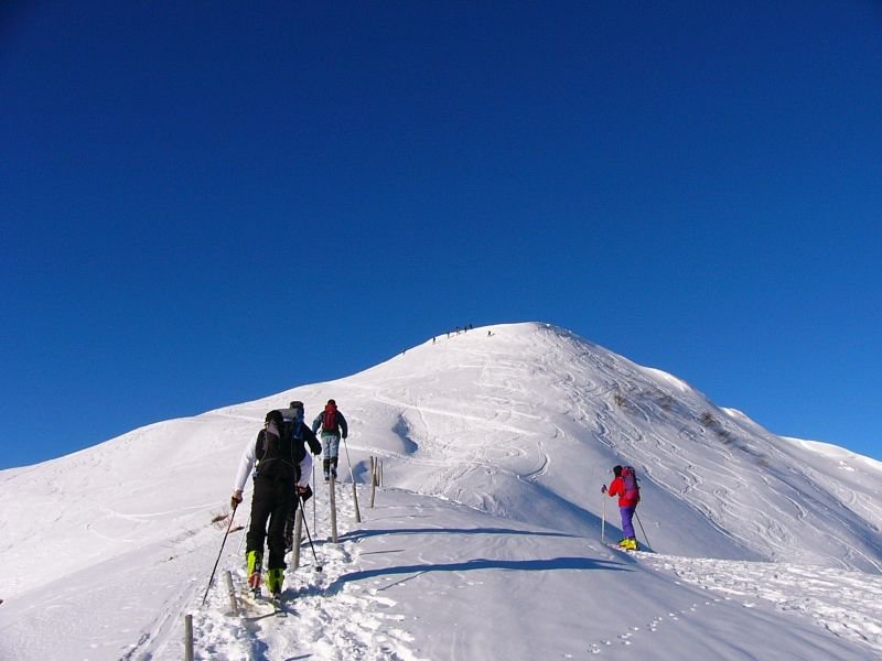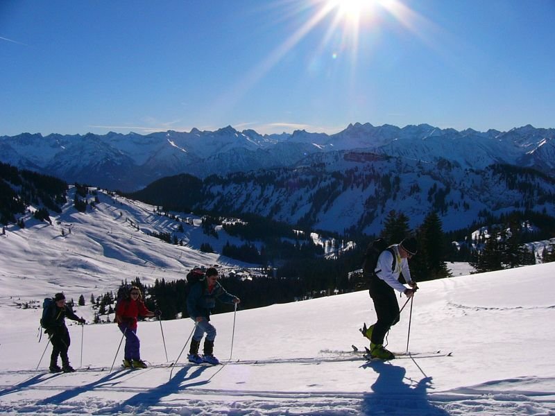 Mit großen Erwartungen, was das Wetter anbetraf und weniger großen in Bezug auf den Schnee, brachen 5 Männer und 5 Frauen nach Balderschwang/Grasgehren zur Tour auf Riedbergerhorn und Großen Ochsenkopf am Sonntagmorgen auf. Als Anfänger- bzw. Einsteigertour geplant, zeigte es sich doch, dass den Unterschieden, was die Kondition anbetraf, Rechnung getragen werden sollte. So startete unser kurzfristig als 2. Tourenführer gewonnener Peter mit 4 Teilnehmerinnen direkt von der Straße unterhalb Grasgehren (kleiner Parkplatz am Beginn der Steigung zum Riedbergpass; etw. 350 HM mehr) und der Rest der Gruppe vom Grasgehrenlift aus zum Riedbergerhorn. Das Warten aufeinander am Gipfel war kein Problem, da der strahlende Sonnenschein, Windstille, gute Fernsicht und die Gipfelgespräche für Kurzweil sorgten. Die folgende gemeinsame Tiefschneeabfahrt bei Pulverschneeauflage (beste Bedingungen !!!) war ein Highlight des Tages, hatten wir doch Bruchharsch erwartet. Normalerweise ist der Nordostgipfelhang des Riedbergerhorns immer "geladen" (siehe Wächten auf den Fotos), aber diesmal war die Lawinengefahr gering und so konnte der Hang direkt vom Gipfel befahren werden (hat Seltenheitswert !!) Nach kurzem Aufstieg zum Großen Ochsenkopf folgte die 2. Rast, die ausgiebig genossen wurde - mit Essen, Gesprächen, Schauen, Ruhen, Meditieren und nicht zuletzt schweigsamem Geniessen der herrlichen Bergwelt (Gabi hatte sich absolute Stille erbeten !). Das Superwetter veranlasste die Teilnehmer, den geplanten Einkehrschwung im Schwabenhaus auszulassen und nochmals zum Riedbergerhorn aufzusteigen, um von dort die Abfahrt zum Ausgangspunkt der 1. Gruppe anzutreten. Hier konnte jede(r) ihr/sein Können testen: Pulver, vereiste Stellen im Waldgürtel, gefrorener Schnee im verspurten Gelände etc.. Die nachgeholte Einkehr in einem kleinen Gasthaus abseits der Straße bei Balderschwang rundete einen u.M. nach sehr schönen Skitag ab. Wir hoffen, dass unsere Anfänger und "Wiedereinsteiger" bei dieser Tour nicht überfordert waren (insgesamt doch ca. 770 HM) und eventuell doch Appetit auf "mehr " bekommen haben.