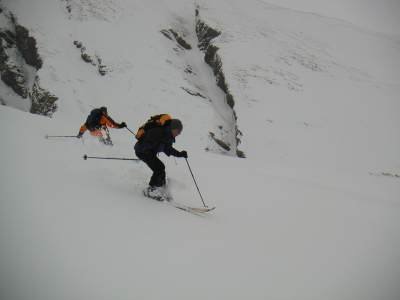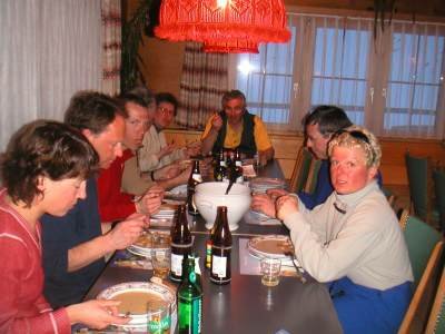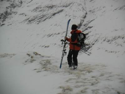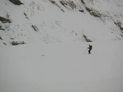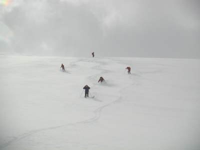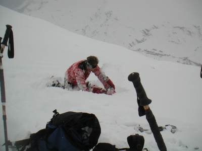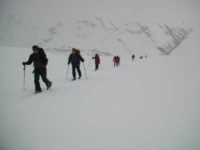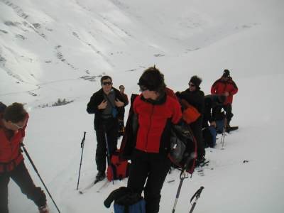 Bericht: Trotz schlechter Wetterprognose machte sich am Samstagfrüh eine unerschrockene Gruppe von Skitourengängern in das südliche Graubündener Averser Tal auf. Die erste Tour zum Grosshorn war am Anfang zwar noch im Nebel, aber aufgrund des Föhneinflusses doch noch ganz passabel zu gehen. Lediglich die Gipfelrast fiel dem heftigen Föhnsturm zum Opfer. Dafür hatte die Abfahrt am Anfang noch Pulverschneebedingungen. Im Hotel Edelweiss in Juf (höchstgelegene Gemeinde Europas) waren wir im Lager mit Halbpension gut und preiswert aufgehoben. Leider war die Nachmittagstemperatur in Juf bei 5° C und durch den starken Föhnwird wurden grössere Neuschneemengen verfrachtet. Die Lawinen- u. Wettersituation bedingte auch die Änderung der Tourenplanung für Sonntag; die Tour zum Piz Piot konnte nicht riskiert werden und so gingen wir über Bergalga zum Bödengrat. Die Bedingungen waren leider nicht besonders gut und kurz vor der Querung eines Triebschneehanges brachen wir die Tour ab (s. Karte). Die Abfahrt gestaltete sich bei Bruchharsch sehr schwierig. Margrit verlor nach einem Sturz einen Ski (die Skibremse versagte !), er sauste den Hang Richtung Schlucht hinunter und blieb kurz vor dem "Totalverlust" liegen. Unter "todesmutigem" Einsatz von Udo konnte der Ski geborgen werden und Margrit musste nicht talwärts laufen. Annette hatte leider Probleme mit ihren Tourenschuhen und brach vorzeitig ab. Wir wünschen ihr mit besser passenden Schuhen einen hoffentlich schmerzfreien weiteren Skitoureneinstieg. Auf dem Rückweg kehrten wir in der urgemütlichen Walserstuba in Cröt ein: beste Schweizer Gastronomie und freundliche Wirtsleute ! Fazit : Auch bei schlechten Wetterbedingungen kein " verlorenes Wochenende " Üb.d. 20.03.2004 W.B. |