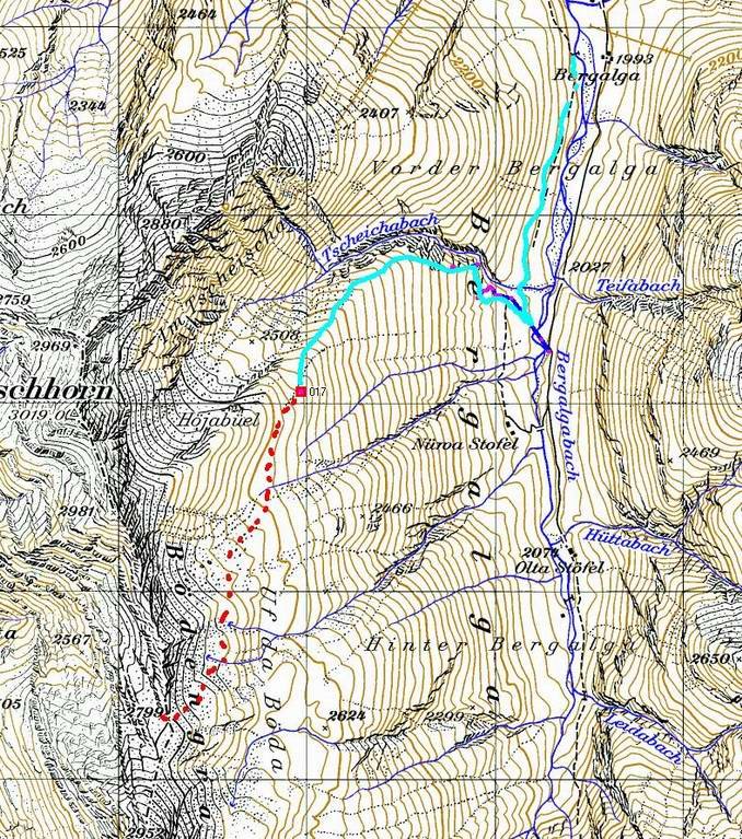 Karte mit eingezeichneter geplanter Route zum Grosshorn (1: 50tsd) (zum Vergrössern: Doppelklick auf Karte) Karte : Ausschnitt aus „© 2007 swisstopo (JD072662)“ mit freundlicher Genehmigung des Verlags |