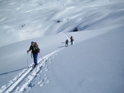 Aufgund der schlechten Wetterprognose für Sonntag wurde die Tour kurzfristig auf Samstag vorverlegt. Leider mussten zwei Teilnehmer aufgrund beruflicher Verpflichtungen daraufhin absagen. Dafür möchte ich mich entschuldigen, muss allerdings darauf hinweisen, dass bei anspruchsvollen Touren die Wetterbedingungen optimal für eine sichere Durchführung sein müssen. Der frühe Samstagmorgen zeigte schon, dass es ein herrlicher Tag werden sollte. Die Nacht war kalt gewesen und alle Hänge waren gut durchgefroren - bis auf die nordseitigen steileren Hänge mit festem Pulverschnee - eigentlich ideale Bedingungen... und von der Schweizer Lawinenvorhersage war für die Nordalpen für Samstag sogar Lawinenwarnstufe 1 vorhergesagt. Trotz des sehr frühen Aufbruchs in Überlingen um 5.00 Uhr waren wir in Gargellen nicht die ersten Tourengänger mit dem Ziel Rotbühlspitze; der Anstieg bis zum Zollhaus war problemlos, lediglich etwas langgezogen; die weitere Spur etwas steiler und bis zum kleinen Sattel unter dem Gipfelhang technisch unproblematisch. Der Gipfelhang zeigte sich bedingt durch einige enge Kehren im steileren Gelände anspruchsvoller, aber durch die guten Schneebedingungen (Pulver!!) unkritisch. Am Gipfel hatten wir eine atemberaubende Rundumsicht: keine einzige Wolke am Himmel und direkte Einblicke in die "blaue Silvretta". Zur Info: ein einheimischer Tourengänger war vom Valzifenser Grat kommend auf unsere Aufstiegsspur gestossen und erklärte uns, dass er über die Rotbühlspitze ins Schlappintal nach Klosters wieder abfahren wollte - nicht offiziell beschrieben, aber machbar !!?? Da es trotz Sonnenscheins aufgrund des Windes doch empfindlich kalt war, wurde ohne Essenspause nur das obligatorische Gipfelfoto ( und ein paar mehr !) geschossen, der Rundblick genossen, die Felle versorgt und dann baldigst die Abfahrt zum Joch angetreten, wo Rolf auf uns gewartet hatte. Der Weg durch die Nordrinne war von den Schnee- bzw.Lawinenbedingungen verantwortbar und so fuhren wir als "Spur 7-11" hinunter. Hinter der Engstelle (Felsen !) war im Schattenbereich noch guter Tiefschnee anzutreffen. Danach wechselten die Bedingungen rasch von Pulver links und Firn rechts in den Mulden, man musste sich das Beste aussuchen. Im unteren Teil hatten wir durchwegs Firn, aber in der Flachpassage war neu aufgetragenes Wachs auf der Lauffläche von Vorteil; zurück am Vergaldener Hof (die Parkerlaubnis hatte ich tags zuvor telefonisch eingeholt) folgte der obligatorische Einkehrschwung ! Fazit: beste Bedingungen, etwas langer Anstieg, rassiger Gipfel mit steiler Abfahrtsrinne, danach Genusshänge; gelungener Saisonabschluss !! P.S.: für Regine erste und wahrscheinlich auch letzte (evtl. beste !?) Tour der Saison ! Üb., d. |