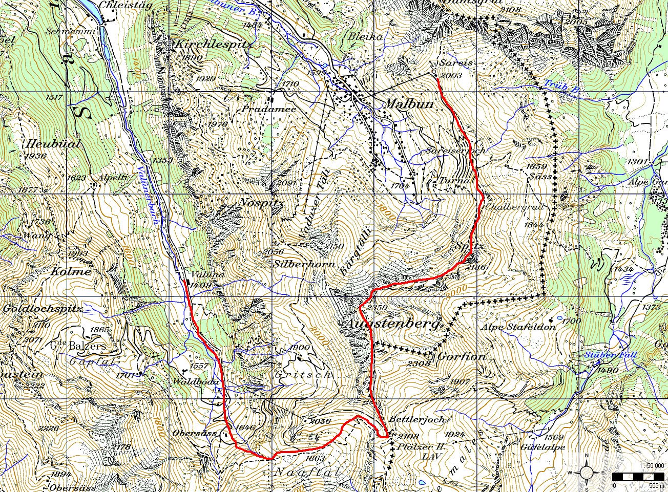 Karte mit geplanter Route (rot) 1: 50000 swissmap 50 Karte : Ausschnitt aus „© 2010 swisstopo (JD072662)“ mit freundlicher Genehmigung des Verlags |
