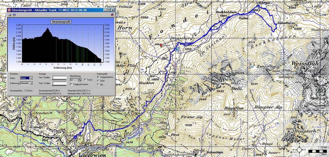 Karte mit durchgeführter Route (Blau) am Sa 1: 50000 swissmap 50 Karte : Ausschnitt aus „© 2010 swisstopo (JD072662)“ mit freundlicher Genehmigung des Verlags |
