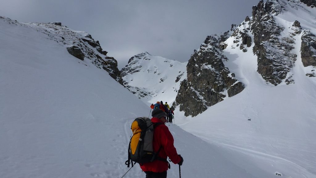 An der Einfahrt zum Pfändertunnel wussten wir es bereits: eine halbe Stunde zu spät aufgebrochen! Gegen 08:30 befanden wir uns leider in Wangs bereits in der Warteschlange der Aufstiegshilfen und mussten die Halbtageskarte für 30 SFR kaufen, oder 1600 Hm aufsteigen, was uns wohl doch zuviel geworden wäre. So konnten wir ab Pizolhütte anfellen und bei aufgeheiterten föhnigem Himmel entspannt aufsteigen. Die Querung zur Wildseeluggen wurde einzeln abserviert, war aber ansonsten unproblematisch. Ab der Scharte kurz auf Fellen abfahrend und dann über den See langsam ansteigend bis zunehmend steiler zum Pisolsattel und Skidepot(2790 m). Unterwegs begegneten wir weiteren alpinen Spielarten wie Schneeschuhen und Airboards. Zum Gipfel führt ein ca. 20-min. Anstieg der allerdings im mittleren Bereich entlang einer Drahtseilsicherung etwas ausgesetzt über vereiste Felsen führt, die nicht ganz trivial sind und somit nur von 3 Teilnehmern begangen wurden, während der Rest der Truppe im Sattel genüsslich vesperte. Leider brach der Föhn zusammen und bei Abfahrtsbeginn standen wir im Nebel und mussten die ersten 300 Hm etwas mühselig nach unten finden wobei die Schneeschicht unter einem geräuschvollem Deckel doch noch Pulvrig war. Sicht aber weiter diffus und bescheiden. Kurzer Gegenanstieg mit u. ohne Felle zurück zur Wildseeluggen und dann Abfahrt bei schlechterem Schnee zur Pizolhütte. Aufstieg u. Abfahrt insgesamt bis hierher ca. 800 Hm. Da Gabriela erst kürzlich eine Knie-Op überwunden hat, zog sie es vor über die Pisten nach Wangs abzufahren während der Rest der Mannschaft sich die Tourenabfahrt nach Vilters antun wollte. Diese Abfahrt begann mit leichtem Bruchharsch und endete nach nicht endend wollenden 1650 HM im superfaulen Sulz an der Kirche in Vilters auf einer Höhe von 520 m bei föhnigen 9° Plus. Hier wartete bereits Gabriela mit dem Vereinsbus und wir konnten gemütlich direkt einladen und im empfehlenswerten Hotel Ilge den unvergleichlich guten Schweizer Most geniessen. Somit waren dies insgesamt fast 2400 Hm Abfahrt und ich möchte allen Teilnehmer mein Lob über diese Leistung aussprechen, das alles ohne ernste Sturz- und Knieverletzung gemeister zu haben, was bei den herrschenden Schnee-u. Sichtverhältnissen nicht ganz selbstverständlich war. Fazit: noch immer Lohnenswerte kürzere Skitour mit Lifthilfe bis 2800 m und sehr lange Abfahrt bis Vilters auf Bodenseehöhe Üb. d. 27.02.2012 w.b. |