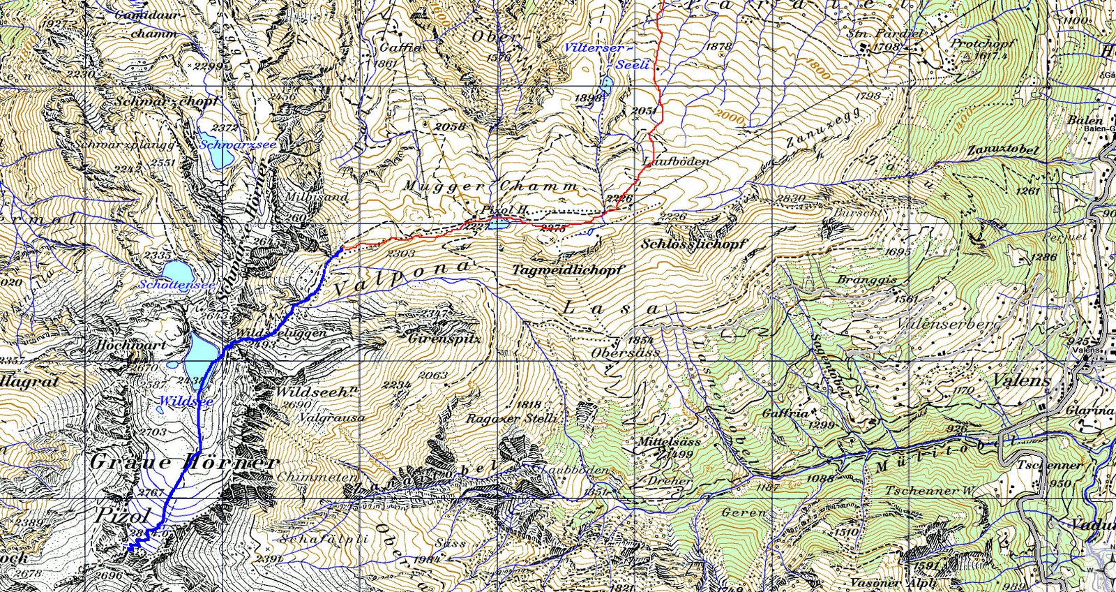 Karte mit durchgeführter Route (blau/rot) 1: 50000 swissmap 50 Karte : Ausschnitt aus „© 2010 swisstopo (JD072662)“ mit freundlicher Genehmigung des Verlags |